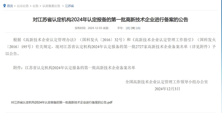 12月3日,,,,,,天下高新手艺企业认定管理事情向导小组办公室正式通告了江苏省2024年认定报备的第一批高新手艺企业备案名单,,,,,,918博天娱乐官网(以下简称“918博天娱乐官网”)依附其在手艺立异、知识产权、产品研发及转化等方面的卓越体现,,,,,,再次乐成获得国家高新手艺企业资质认定,,,,,,证书编号为GR202432000848。。。。。